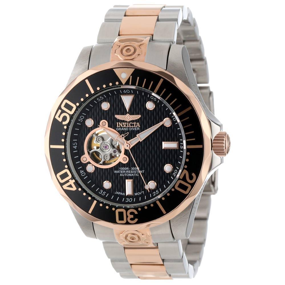 Invicta 13708 Grand Diver men’s automatic dive watch features a 47mm wide and 15mm thick solid stainless steel case with a scalloped edged black accented rose gold tone unidirectional rotating bezel and textured screw down crown. Invicta 13708 is powered by an accurate Japanese NH38A automatic movement with 24 jewels. This stylish watch also features a textured black dial with white accents rose gold tone luminous hands and index hour markers, scratch resistant mineral crystal and water resistant to 300 meters. Invicta 13708 is equipped with a 21mm wide two tone rose gold ion plated solid stainless steel bracelet with a fold-over deployant safety clasp. Invicta 13708 men’s Grand Diver black dial two tone rose gold plated steel bracelet automatic dive watch is brand new and comes in an original Invicta gift box and is backed by a 3 years limited warranty.