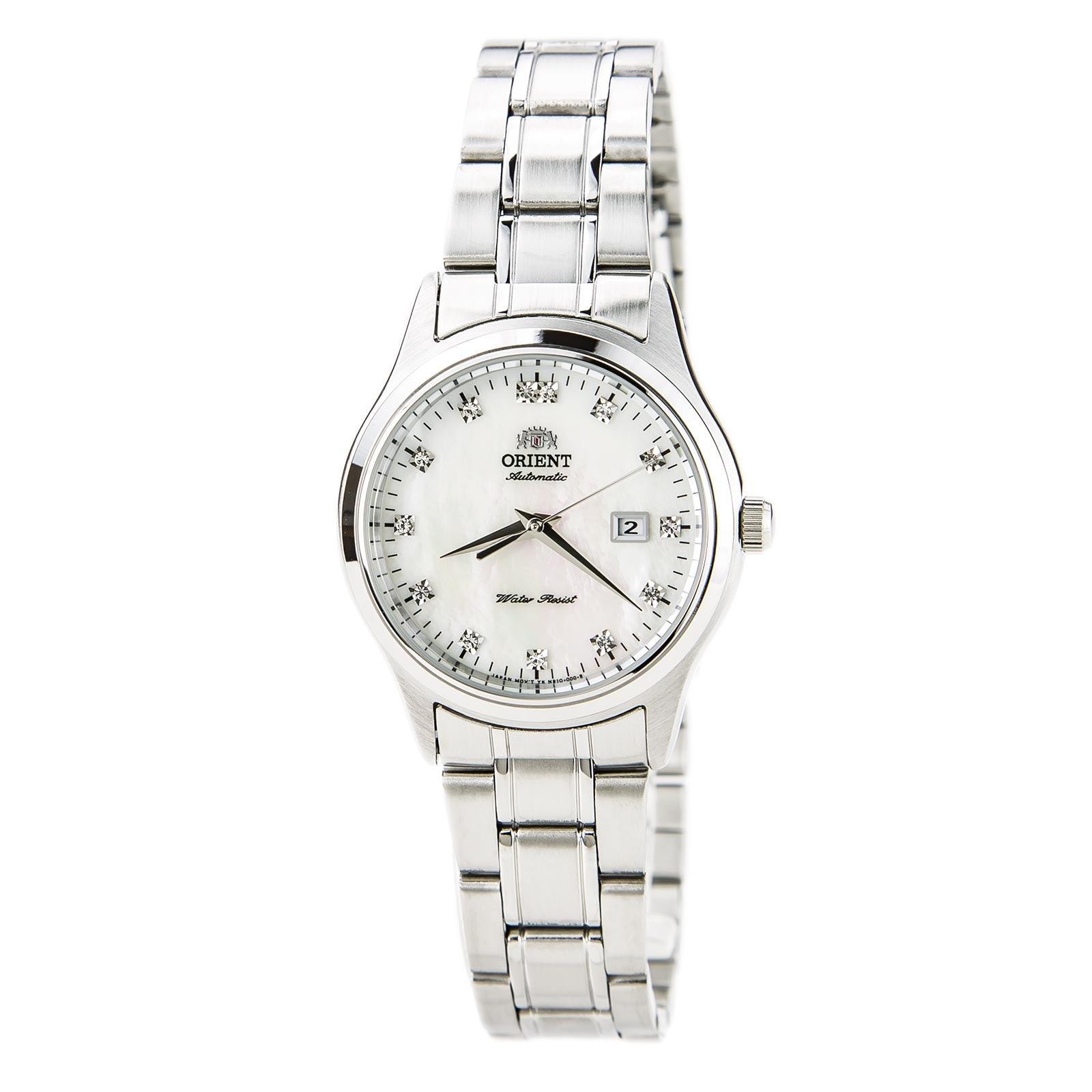 Orient NR1Q004W Charlene automatic women’s watch features a 31mm wide and 12mm solid stainless steel case with textured push/pull crown. Orient NR1Q004W is powered by an accurate Japanese Orient Caliber 55741 automatic movement. This beautiful watch also features an attractive white mother of pearl dial with silver tone hands and crystal hour markers, date function, protected by scratch resistant hardlex crystal, and water resistant depth is 50 meters. Orient NR1Q004W is equipped with a solid stainless steel bracelet with fold over clasp. Orient NR1Q004W Women’s Charlene stainless steel white dial automatic crystal watch is brand new and comes in an original Orient gift box and is backed by an 1 year manufacturer warranty.