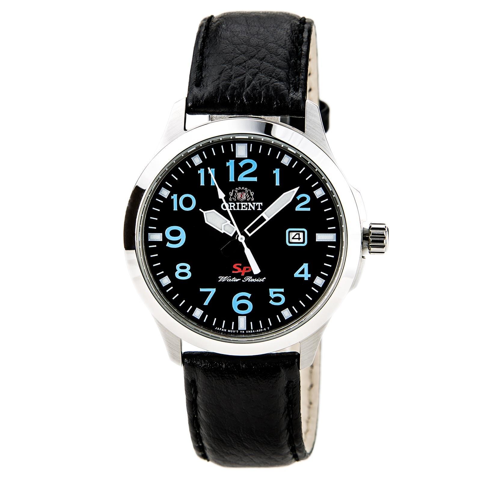 Orient UNE4009B SP men’s watch features a 44mm wide and 8mm thick solid stainless steel case with a fixed bezel and a textured push-pull crown. Orient UNE4009B is powered by an accurate Japanese quartz movement. This stylish watch also features a sharp looking black dial with white luminous skeleton hands and Arabic numeral hour markers along with the date display function, scratch resistant mineral crystal and water resistant to 50 meters. Orient UNE4009B is equipped with a 20mm wide black leather strap with a buckle clasp. Orient UNE4009B men’s SP black dial stainless steel leather strap watch is brand new and comes in an original Orient gift box and is backed by a 1 year limited warranty.