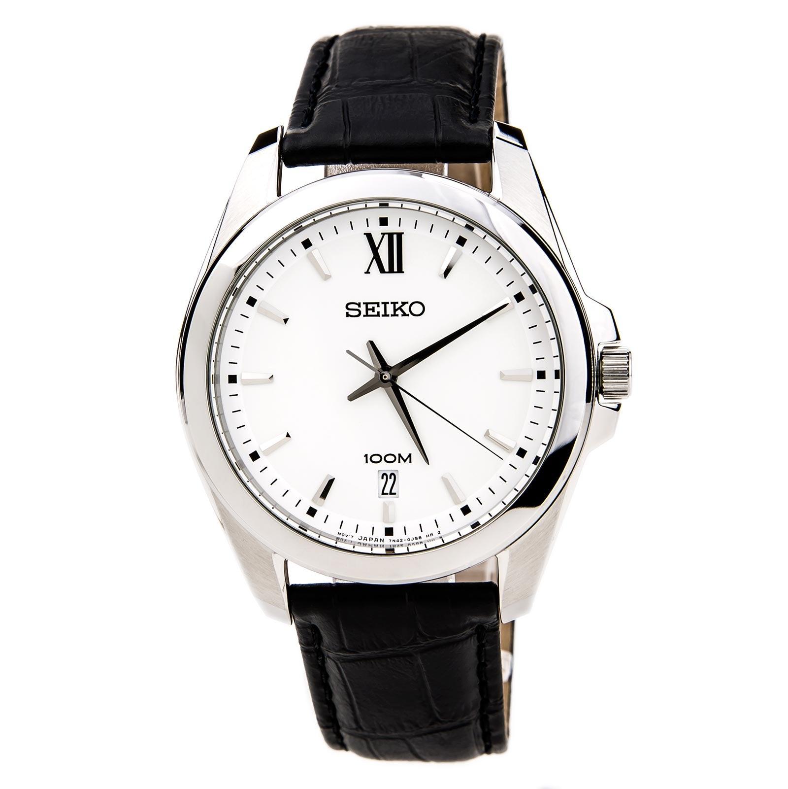 Seiko SGEG77 men’s watch features a 40mm wide and 9mm thick solid stainless steel case with a fixed bezel and a textured push-pull crown. Seiko SGEG77 is powered by an accurate Japanese quartz movement. This stylish watch also features a sharp looking white dial with silver tone luminous hands and index hour markers along with the date display function, scratch resistant mineral crystal and water resistant to 100 meters. Seiko SGEG77 is equipped with a 20mm wide black leather strap with a buckle clasp. Seiko SGEG77 men’s white dial black leather strap watch is brand new and comes in an original Seiko gift box and is backed by a 3 years for USA and 1 year international limited warranty.