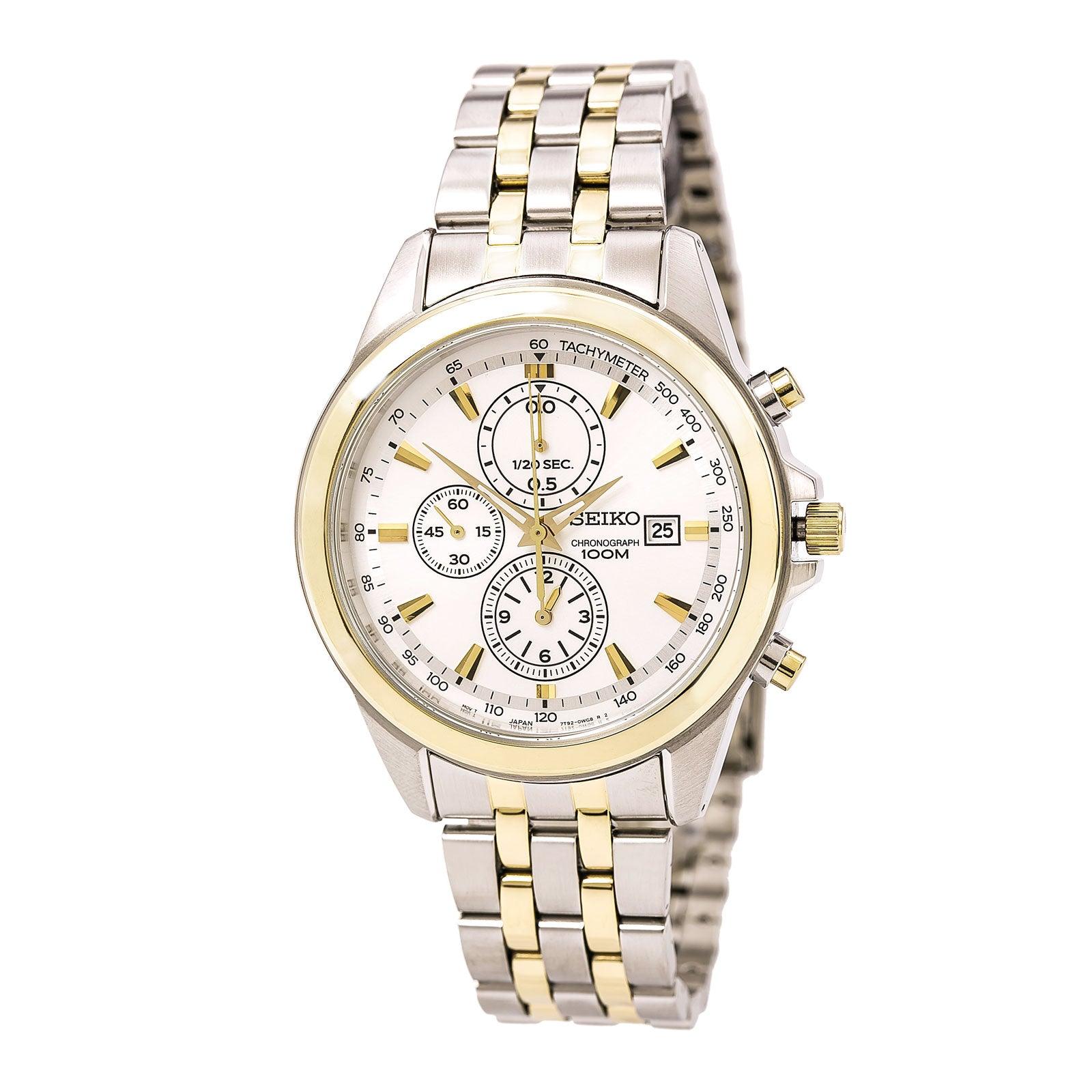 Seiko SNDF04 chronograph men’s watch features a 44mm wide and 10mm thick two tone gold plated solid stainless steel case with a fixed bezel and textured screw down crown with function pushers. Seiko SNDF04 is powered by Japanese 7T92 quartz chronograph movement. This stylish watch also features a textured silver dial with silver accents gold tone luminous skeleton hands and index hour markers along with the chronograph, tachymeter and date display function, scratch resistant hardlex crystal and water resistant to 100 meters. Seiko SNDF04 is equipped with an 18mm wide two tone gold plated solid stainless steel bracelet with fold over safety lock clasp. Seiko SNDF04 men’s chronograph silver dial two tone stainless steel bracelet watch is brand new and comes in an original Seiko gift box and is backed by Seiko 3 year USA and international 1 year limited warranty.